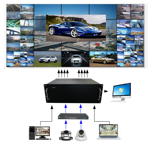 外置拼接解碼處理器(H.265)是專門為同時(shí)接入處理網(wǎng)絡(luò)攝像機(jī)(IPC)和外部源輸入信號(hào)(HDMI,DVI,VGA等)而設(shè)計(jì),采用最新的專用圖像解碼芯片與FPGA搭配,通過(guò)專用圖像解碼芯片解碼網(wǎng)絡(luò)攝像機(jī)的信號(hào),然后再和通過(guò)FPGA接入的外部源輸入信號(hào)混合處理,實(shí)現(xiàn)圖像切換,拼接,開窗,漫游等功能,是目前解決網(wǎng)絡(luò)攝像機(jī)
